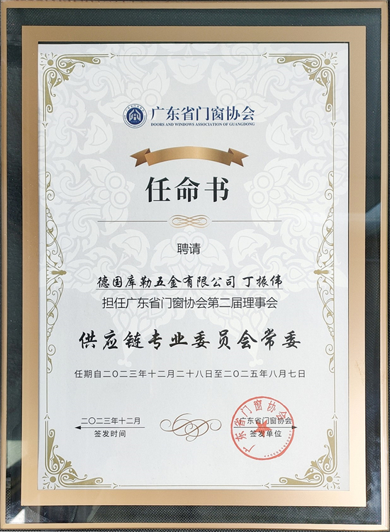 - 庫勒五金董事長丁振偉被授予廣東省門窗協會供應鏈專委會常委 - 2024/01/30