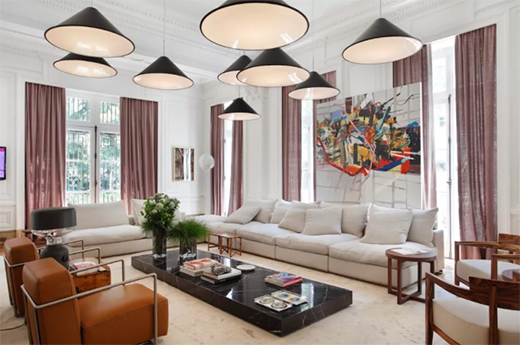 這些窗簾像是飛流而下的瀑布,令人感到驚奇。地毯造型形似一汪碧綠池水,倒映著曼妙多姿的睡蓮。窗簾和地毯以及其他紡織品聯合現代家具與藝術陳設,共同構建了這個美輪美奐的室內場景。