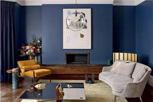 藏藍色墻面背景與窗簾搭配黃色沙發,是冷靜紳士邂逅溫婉淑女,個性鮮明的色彩對接展現著強有力的視覺沖擊。