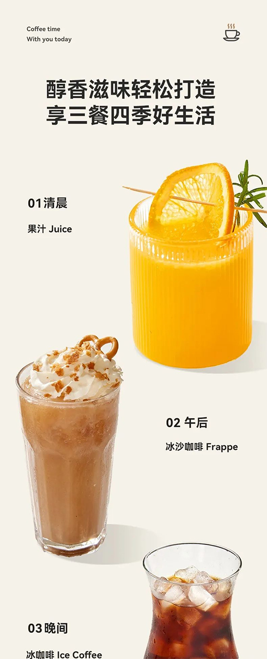 一年365天早中晚,一年四季春夏秋冬,只要你需要它,它都能隨叫隨到??Х裙涛糨喎瑏恚蝗杖涂谖恫恢貥印@錈釡馗须S意調,無懼嚴冬與酷暑。所以,咖啡控、果汁控的寶寶們是不是有福啦?