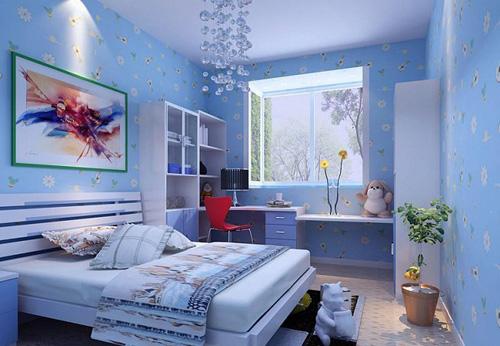 在臥室里采用淺藍色碎花歐雅壁紙,朵朵桃花花姿俏麗,迎風綻放清新自然,讓人在春日里感受到一絲絲清涼。淺藍色會讓人感覺空間更明亮,而碎花的圖案會讓客廳更添親切感,溫馨而又舒適。搭配簡潔的沙發、單純的色彩和質樸的風格讓居室呈現出一種理性之美,不免將人帶入春的美好意境。