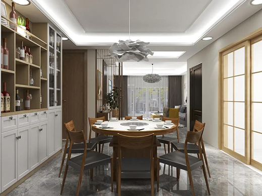 餐廳的位置在整個家的格局布置中顯得比較奇妙,作為整個家庭使用相對頻繁的地方,一圓桌六椅一燈的簡單布局恰恰提高了它的實用性,原木與“蛋殼光”純色墻面相交呼應,再加上整體酒柜收納的搭配,極為簡單,實用,也非常簡約、大方。