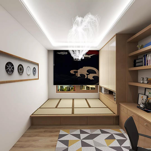 次臥中的榻榻米更是把日式風的精髓,表達的淋漓盡致。其實榻榻米就是草席,大概很少有人知道榻榻米源自中國。具有超強儲物功能的榻榻米,讓空間更加整潔干凈。作為日式風格的標簽之一,榻榻米塑造的空間柔和又充滿了可變性。遒勁有力的日式裝飾懸于墻上,仿佛進入了展館一隅,為簡約的空間注入了華彩和力量。無論是暢聊心聲,還是一個人的精心冥想,抑或是一家三口的其樂融融,這方小天地里納下了各種美好時刻。