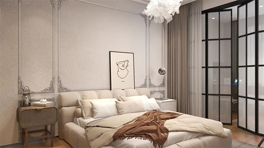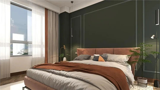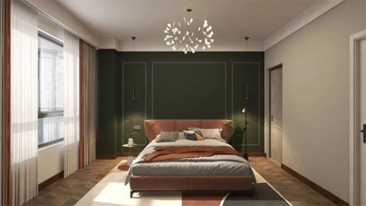 客房相對(duì)于主人房會(huì)更加沉穩(wěn)內(nèi)斂,暖白與苔蘚綠搭配和諧了整個(gè)空間,使空間更有層次感,營造了一個(gè)唯美的臥室環(huán)境。
