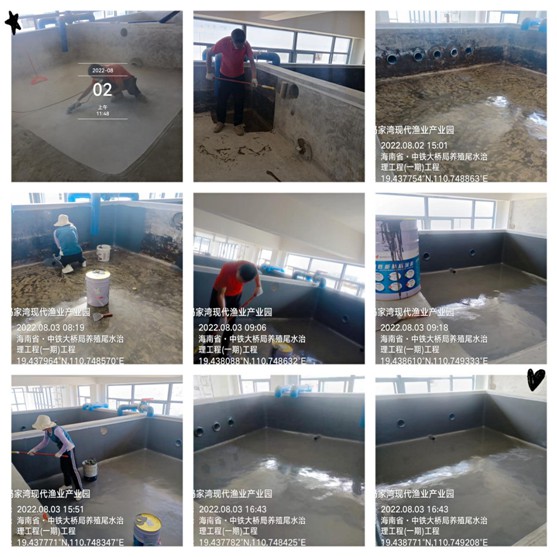 2022年8月,廣東華珀科技有限公司受到海南省文昌市馮家灣現(xiàn)代漁業(yè)產(chǎn)業(yè)園的邀請,對標準養(yǎng)魚池經(jīng)常出現(xiàn)的裂漏問題進行綜合分析并提供專業(yè)解決方案。我公司根據(jù)業(yè)主所反饋問題,結(jié)合之前所采用的材料及施工工藝進行綜合研判,決定采用HP-506單組分聚脲防水防腐涂料進行涂刷施工。目前該工程已順利完工,進入工程驗收環(huán)節(jié)。此項目有力推動馮家灣現(xiàn)代化漁業(yè)產(chǎn)業(yè)園高質(zhì)量建設(shè),為“發(fā)展水產(chǎn)種業(yè),共創(chuàng)現(xiàn)代漁業(yè)”提供聚脲工程支撐。