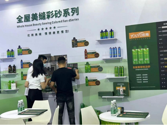 本次展會上,優雨打造簡約風格的家居式展廳,現場陳列優雨的金剛砂、經典砂、靚典砂、美容收邊砂等系列產品,展示了優質、高效、經濟、環保的瓷磚縫隙美化解決方案,贏得眾多參展客戶的駐足與贊賞,使優雨成為展會期間當之無愧的一道靚麗風景線。