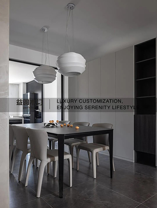 將公共空間的收納更多集中在餐廳的一側(cè),保持恰當?shù)捏w量,兼具遮物和陳列兩種功能,柜門留白最大限度讓表明平整無飾,讓空間在視覺上更充裕。