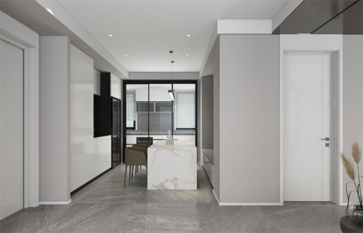 柜門與室內(nèi)門選用同一材質,讓室內(nèi)空間更為流暢。長島臺一體設計,為親友聚餐增加就餐空間的同時,也能化身小戶型的辦公區(qū)域,讓一杯手沖咖啡的香氣,打造格調(diào)感十足的居家辦公氛圍。