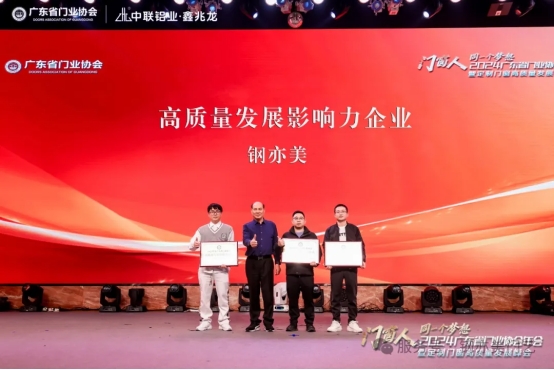 2024年12月30日,在廣東省門業協會主辦的“門窗人·同一個夢想——2024廣東省門業協會年會暨定制門窗高質量發展峰會”上,廣州鋼亦美門業有限公司成為了矚目的焦點,一舉榮獲高質量發展影響力企業獎,并榮升副會長單位。