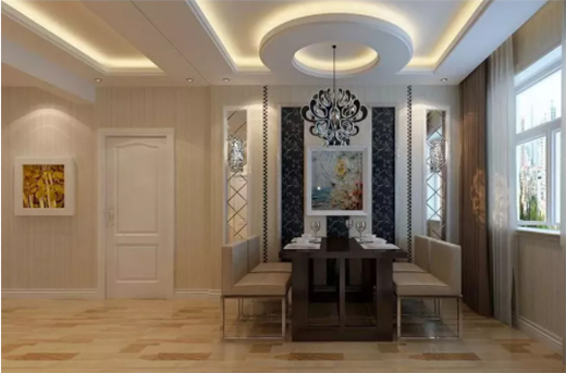餐廳通常與客廳相連,用吊頂做功能區(qū)分,圓形吊頂配合柔和的燈光纏繞成一首小調(diào),讓餐廳在簡約的同時(shí)又帶有一絲溫馨的氣息。