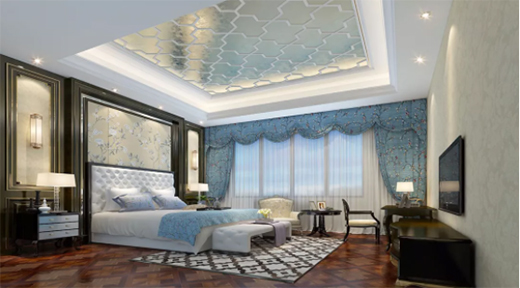 立體感十足的吊頂讓臥室整體看起來非常的有層次感,條紋交叉有序,豐富空間視覺元素,給人一種清澈感。