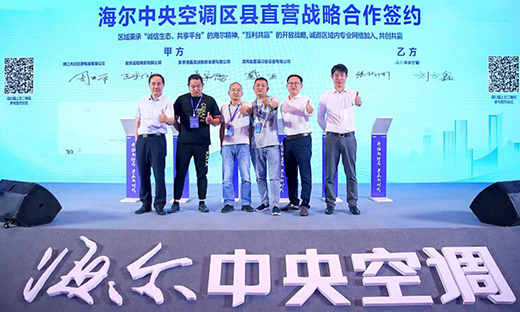 最后,海爾中央空調市場總監張新剛、海爾中央空調渠道總監劉方鑫、靖江市欣欣家電城有限公司周亞平、安慶迎冠商貿有限公司王守風、張家港鑫宜潤智能家居有限公司朱宇雷、濱海縣菱瑞冷暖設備有限公司沈海州以及現場所有生態伙伴,共同開啟區縣直營戰略簽約儀式,正式加入海爾中央空調的合作陣營。