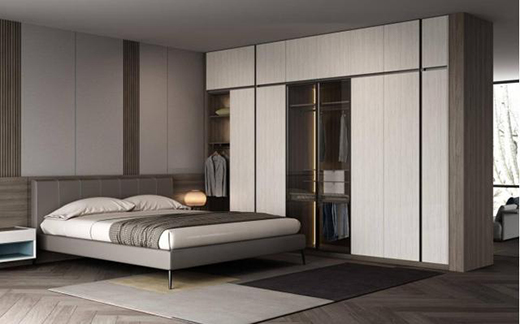 臥室衣柜則是采用膚啞門板,觸摸起來感覺細膩,放眼則極具有視覺享受,讓人內心恬淡,整個臥室都充滿靜謐情調,營造一個優質睡眠環境。