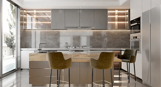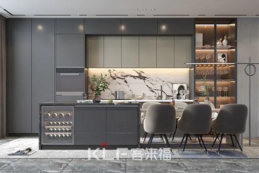 高級灰擁有優雅的色彩,一直以來都是時尚的象征,低調的質感彰顯著極致的魅力。當低調不張揚的高級灰與廚房空間結合,搭配金屬配件,碰撞出優雅輕奢的火花。
