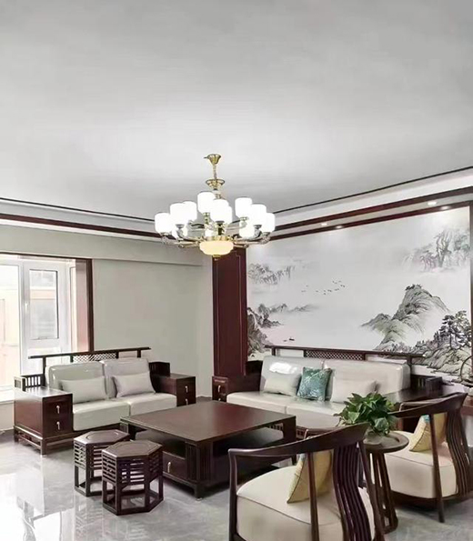 客廳空間圍合式的中式實木家具,真實地展現出實木的獨特品味:自然、高檔、厚重。搭配大氣磅礴的水墨壁畫,打造了一個古典又儒雅的新中式時尚之家。