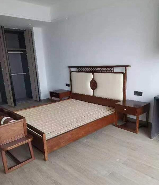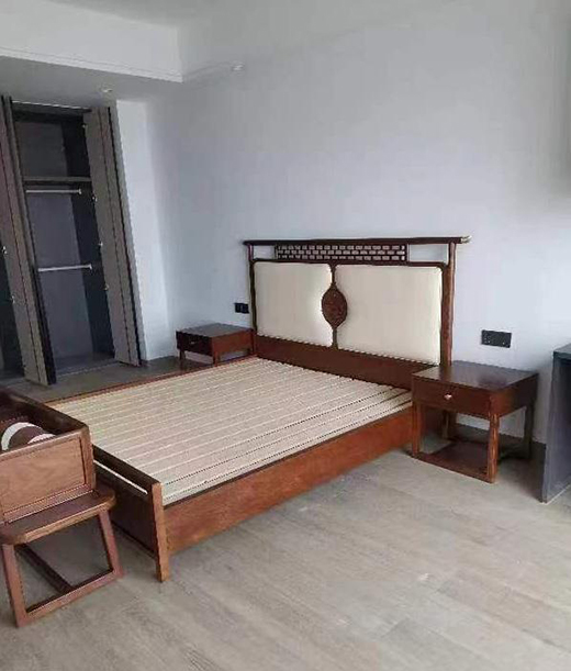 臥室延續了客餐廳的裝修風格,實木大床靠墻中間擺放,兩則對稱搭配小巧的實木床頭柜,床尾是配套系列的床尾凳,用一體化的整體設計,提突出了全屋定制的整體優勢,充分迎合了業主的生活習慣及審美標準。
