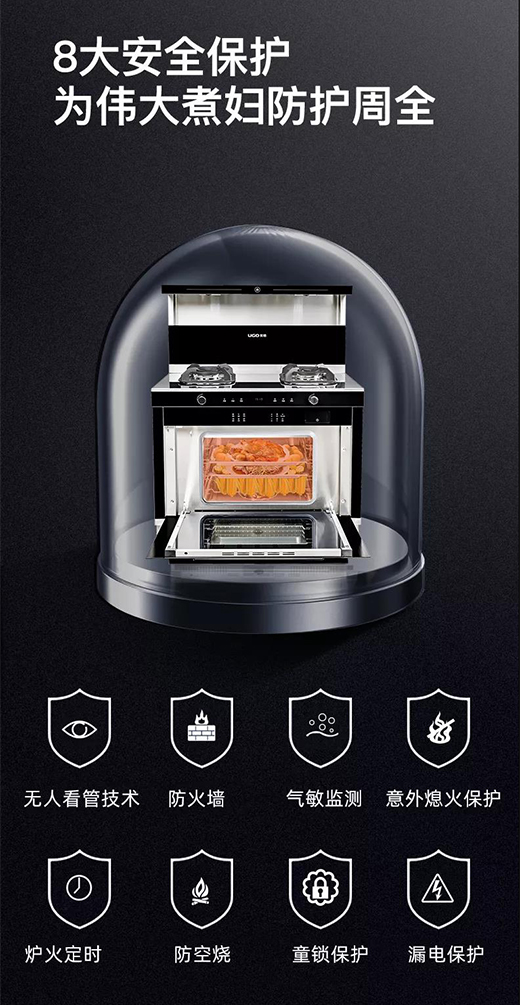 對廚電而言,安全性是必須保證的基本。優格集成灶多重安全防護,空燒報警、極速防火墻、熄火保護、氣敏監控、安全童鎖、漏電保護等多重安全防護墻設計給你從一而終的安全感。