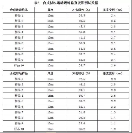 場地面層的垂直變形也不能太小,場地面層垂直變形越小,場地表面就越硬,不利于對運動員的安全保護。歐盟標準EN 14877-2013《戶外合成材料運動場地技術要求》規定了田徑場地面層垂直變形值上限為3mm,國家標準GB/T 14833-2011和 GB/T 22517.6-2011規定了田徑場地面層垂直變形下限為0.6 mm,因此參照以上歐盟標準和國家標準要求,并且結合實際檢測結果(見表5),將本標準的垂直變形規定為0.6 mm~3 mm。
