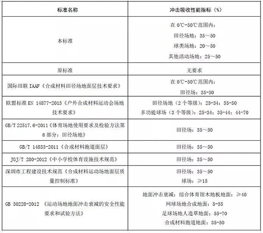 沖擊吸收是目前國際通行的衡量合成材料運動場地面層運動性能和緩沖保護性能的核心指標,在國際田聯、國際足聯、國際籃聯、歐洲標準中都有相應的規定。國家標準GB/T 14833-2011和 GB/T 22517.6-2011對合成材料跑道面層的沖擊吸收也進行了相關規定,要求沖擊吸收數值為35%~50%,另外,GB 30228也對運動場地的沖擊衰減性能做出了強制性要求。