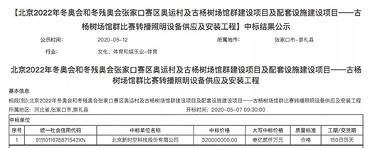 2020年5月,據河北省招標投標公共服務平臺信息顯示,北京新時空科技股份有限公司中標冬奧會建設項目——古楊樹場館群比賽轉播照明設備供應及安裝工程,中標金額3.2億元,工期150天。