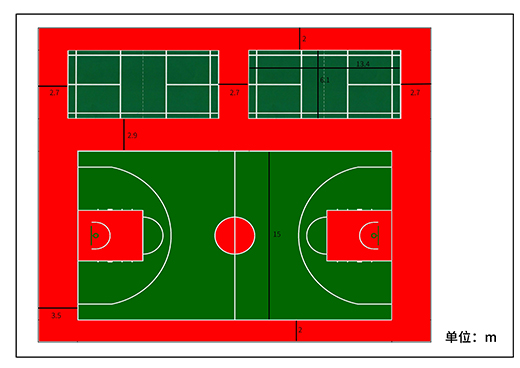 硅PU材料: 硬度適合、耐侯性能良好、耐磨性能出色、抗污能力強、環保。即硅PU籃球場。