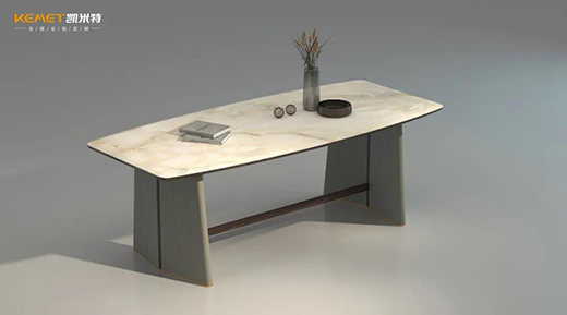 長餐桌:這是個2200的長餐桌,可坐8人。臺面的兩長邊用弧線,使產品更靈動,采用巖板與原木復合來用,白玉色的臺面與木色之間搭配有質感和檔次,腿部運用三角形造型,呼應于沙發,以及顏色的搭配呼應于柜體。腿部鋁材為主材,中間點綴原木,底下點綴銅,整體外觀簡潔、大氣、奢華。