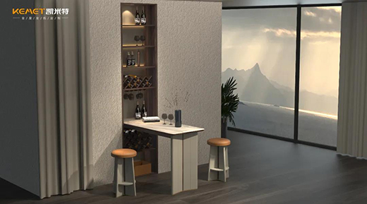 吧臺:帶小酒柜的吧臺,置于餐廳或客廳一面墻,用于家庭小情調小酌兩杯,外形簡約大方,呼應于系列元素,采用巖板與木結合的臺面提高時尚度和檔次,同時也方便于清潔。