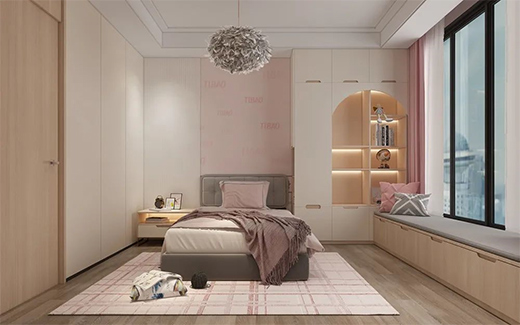 兒童房在造型上可以多花點心思,比如柜門的設計,增添童趣。其他空間的柜子保持統一,并重視實用性。