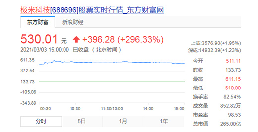 2021年3月3日,國內投影設備企業成都極米科技股份有限公司(簡稱“極米科技”,代碼“688696”)在科創板上市。當日收盤,公司股價報530.01元/股,較發行價133.73元/股上漲296.33%,公司總市值達到265億元。