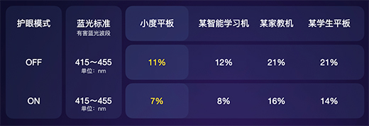「優視藍」的護眼效果得到了中科院的權威認證:在小度智能學習 平板的護眼模式下,有害藍光波段低至7%,低于市面主流的各大品牌智能學習機、家教機、學生平板等,護眼標準刷新行業天花板。