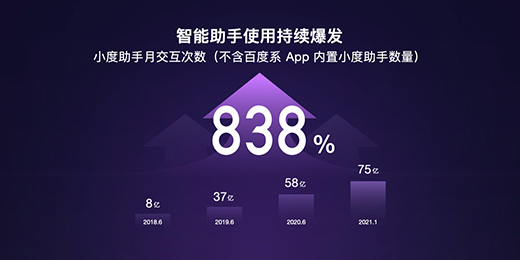 經過多年發展,小度助手已全面升級至6.0,合作伙伴品牌超過500家,開發者社區擁有開發者超過47000名。截至2021年1月,小度助手月交互次數達75億次(不含百度系App內置小度助手數量),較2018年6月增長838%,使用持續爆發。得益于用戶體驗的改善,領先的AI能力及自主研發的芯片,2020年小度智能屏出貨量穩居全球市場份額第一,深入千家萬戶,融入人們日常生活的各個場景。