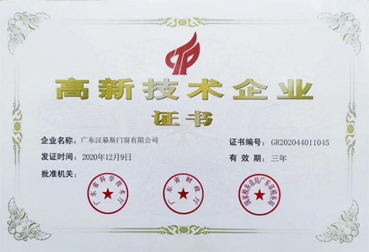 目前,漢慕斯門窗擁有20多項國家專利,榮獲“中國十大鋁合金門窗品牌”、“中國十大家裝門窗品牌”等榮譽稱號,受到門窗行業(yè)與消費者門窗的廣泛贊許與認可。在2021年通過國家高新技術企業(yè)認定標準的嚴格篩選,廣東漢慕斯門窗有限公司榮獲“國家高新技術企業(yè)”專業(yè)認證。