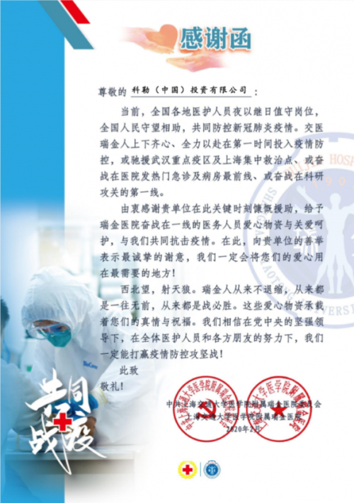 為此,瑞金醫(yī)院特發(fā)感謝函,向科勒表達了誠摯的謝意!
