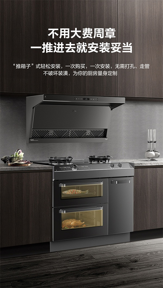 針對這一問題,美的烹飪立方·悅立方采用集成設計,整合灶具、蒸箱、烤箱、煙機以及帶消毒功能的儲物柜,安裝時采用“推箱子”式輕松安裝,無需打孔、走管,不破壞裝潢,最大化地利用有限的廚房空間,優化廚房整體布局,提升廚房整體的適用性與合理性。除了布局上的優化,在空間搭配上,集成一體化的設計讓廚房化繁為簡,簡約的外觀設計也可以輕松匹配不同裝修風格,更滿足當代人的美學需要。