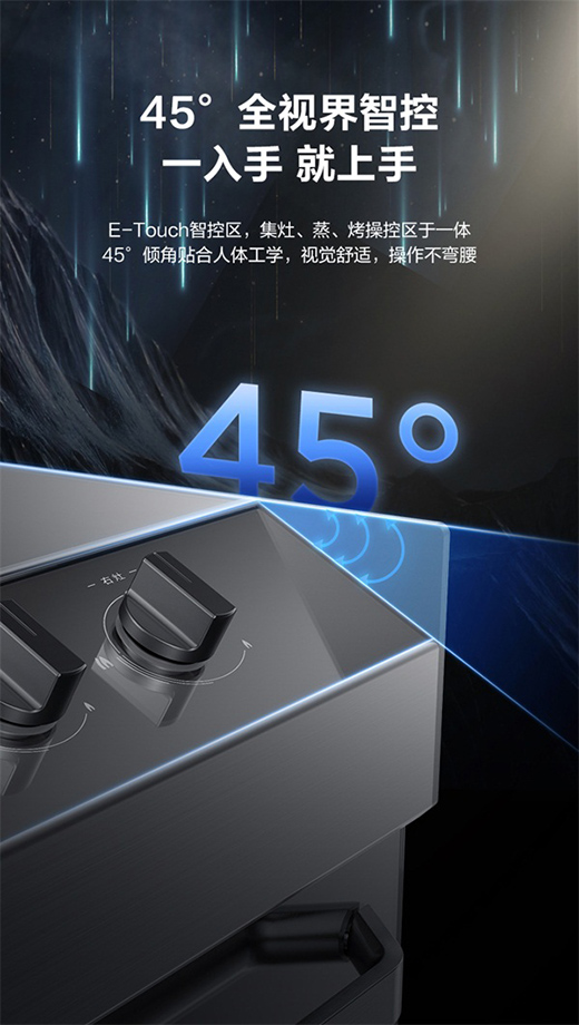 美的烹飪立方·悅立方不僅是各個產品的功能集成,還為消費者提供了完整而流暢的烹飪動線解決方案,為用戶合理規劃廚房動線,減輕下廚負擔,帶來輕松的烹飪環境。烹飪立方設置了E-Touch智控區,集灶,蒸,烤操控區于一體,所有控制都在同一個面板上操作,優化烹飪動線,用戶不必來回走動即可操控不同廚電,能夠在多種烹飪方式之間自如切換,,整餐烹飪統籌控制。此外,E-Touch智控區采用45°傾角設計,貼合人體工學,操作時視覺舒適,無需彎腰,讓廚房日常變得更加簡單輕松。