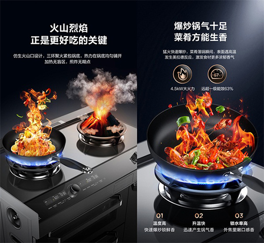 美的烹飪立方·悅立方灶具仿生火山口設計,三環聚火緊包鍋底,熱力在鍋底均勻鋪開,加熱無盲區,煎炸無糊點。同時具備猛火快速爆炒功能,菜肴落鍋瞬間,表面遇到高溫發生美拉德反應,激發食材更多濃郁香氣,輕松應對各種烹飪需求。高溫度快速爆炒鎖鮮香、快升溫迅速產生鍋氣香、高鎖水率造就外焦里嫩口感香,烹飪立方·悅立方的灶具用匠心黑科技幫助用戶烹飪絕佳風味。