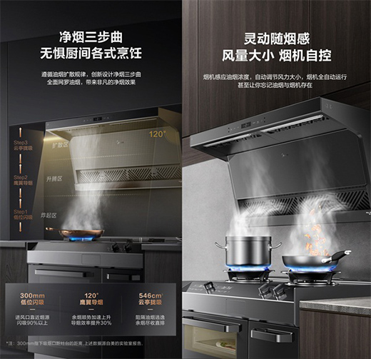 而在煙機設計方面,煙機與烹飪立方灶具、蒸箱、烤箱進行全局聯動,當灶具、蒸箱或烤箱啟動后,煙機就會自動開啟,用戶無需分神操控。同時配置隨煙感功能,煙機可以自動感應油煙和油煙濃度,自動調節風力大小,無需動手操控。并且遵循油煙擴散規律,創新設計300mm低位閃吸、120°鷹翼導煙、546cm3云亭攏吸的凈煙三步曲,全面網羅油煙,輕松應對廚間各式廚房油煙。同時,煙機搭載了110°C高溫滅菌蒸汽洗功能,深度清潔頑固油污,讓煙機保持持久大吸力。