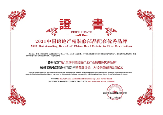 老板電器憑借其行業(yè)領(lǐng)先的智能制造工藝、國(guó)家級(jí)工業(yè)設(shè)計(jì)、優(yōu)異的產(chǎn)品品質(zhì)和市場(chǎng)表現(xiàn)榮獲“2021中國(guó)房地產(chǎn)全產(chǎn)業(yè)鏈服務(wù)優(yōu)秀品牌”獎(jiǎng)項(xiàng)。