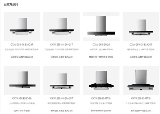拿云魔方系列的 8 款油煙機(jī)舉例,如果把做這些油煙機(jī)型號(hào)和關(guān)鍵詞遮住,一眼望去,縮略圖上的油煙長(zhǎng)得差不多,很容易出現(xiàn)前文提到了實(shí)體店混淆產(chǎn)品功能的情況。