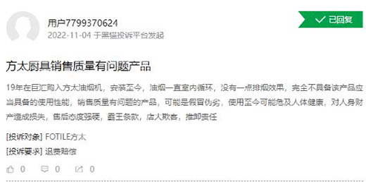 近日在黑貓投訴平臺(tái)上有用戶稱,3 年前在線下購(gòu)入的方太油煙機(jī)一直存在質(zhì)量問題,至今都沒有得到很好的解決方案。