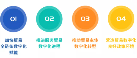 《規劃》中提出構建綠色貿易體系,包括加快貿易全鏈條數字化賦能、推進服務貿易數字化進程、推動貿易主體數字化轉型,鼓勵數字賦能,大力發展數字貿易,加快發展跨境電商、市場采購貿易、企業海外倉、保稅維修等貿易新業態新模式,從而促進外貿的數字化轉型,增強外貿創新發展的內生動力。具體落實措施包括推動外向型產業依托產業互聯網平臺提升智能制造水平;搭建云展會等線上平臺,促進數字化營銷;拓展國際貿易“單一窗口”功能,推動通關智能化,持續推進進出口許可證件無紙化,支持生產型外貿企業開展產品研發等全價值鏈數字化轉型。鼓勵貿易型企業提升數字化服務水平,提供智能、便捷、高效的服務等內容。