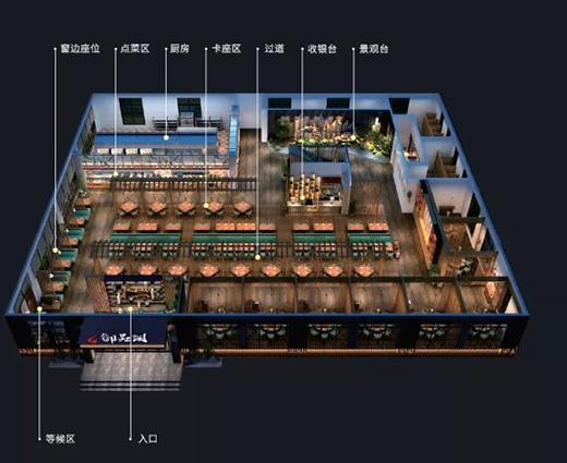 包含入口、觀景臺、等候區,公共空間主要用于展示餐廳氛圍和風格,通過形象墻來表達餐廳的文化涵義及基調,吸引顧客入店。可采用的燈光照明方式也多種多樣,具體視設計情況而定。