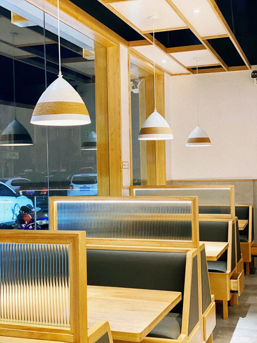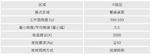 包含卡座區、窗邊座位、包廂、宴會廳,卡座區照明一般運用重點照明來提升整體氣氛,一般選用顯色性高RA≥90的光源,色溫3000K為佳,使人對食物產生色味俱佳的感覺,促進食欲。