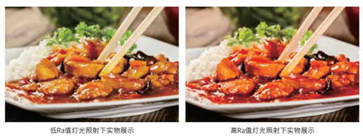 在餐桌附近的局部照明,選用顯色性較高的光源,在Ra值較高的暖色照明環境下,菜品顯得比日照下更加新鮮誘人。