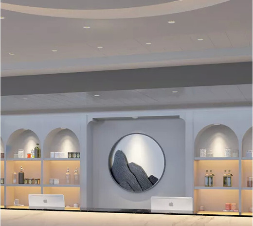 少量筒燈進行普通的環境照明,增加店內更好的視覺感受;明裝射燈和半嵌入式燈具在滿足高照度、高定向性的同時,也能對收銀臺進行裝飾性照明,確定整個店鋪的中心位置;罩式燈具可以將光源暗藏于內,有更好的定向性,帶罩式吊燈款式多樣,為店面增添一些別致的視覺感受。
