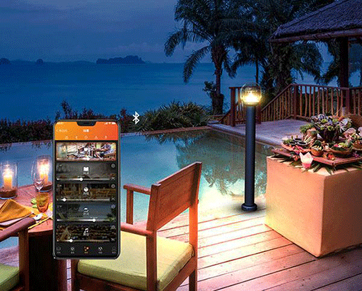 5、當賓客來訪,可以通過手機遠程一鍵開啟“迎賓模式”,燈光輕柔的隨著音樂等協調工作,營造溫馨浪漫的庭院氛圍。