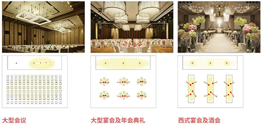 考慮到宴會廳場景變化多樣、擺場多變的情況。當大型會議舉辦時,更應該注重桌面照度,提升主席臺照度,降低裝飾光,讓人保持專注力,營造嚴謹的會議氛圍;當大型宴會及年會典禮舉辦時,著重將主席臺燈光弱化,轉而提高大廳燈光的亮度和飽滿度,明亮的環境光更能烘托熱鬧的氛圍;當西式宴會及酒會舉辦時,燈光需要有指向性地聚焦于餐桌區,并降低環境亮度。通過強烈的視覺對比,營造精致氛圍感。