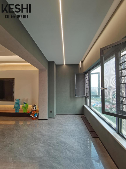 女兒房與兒子房相對較大,所以在吊頂設計上,都布局了天花燈槽明裝線性燈,智能調光調色,能很好地為空間營造高級氛圍感。