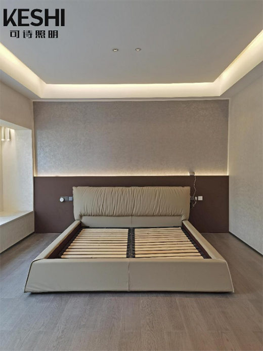 床尾安裝兩盞智能防眩射燈,遠離床頭,避免平躺時燈光刺眼。業主后期也可以選擇在床尾處擺放沙發、茶幾,打造成床尾閱讀區或休閑區,那床尾射燈就剛好能為日常的閱讀、活動提供所需的照明。