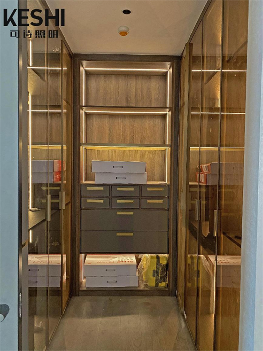 在主臥的巨型衣柜處,還應用了三盞智能射燈,開燈后光投射到衣柜上,能形成漂亮的“小山丘”,既能提供光照,又能裝飾衣柜,一舉兩得。